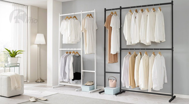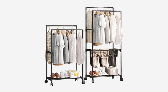 - 르네 2폭 행거 선반형 이동식 행거 옷걸이 스탠드 드레스룸 옷장 미니 철제 선반